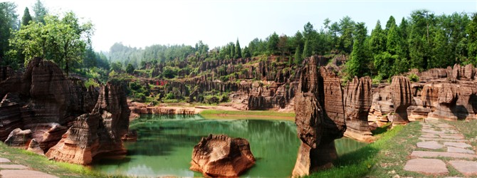 在眾多的奇觀絕景致中,最以“巨人園”,“古城故宮”,“八封奇陣”和“諸葛藏書”等景色最佳。石林東部有一尊高 12.26米的石柱,巍然聳立,挺拔偉岸,其神態(tài)模樣酷似領(lǐng)袖人物的雕像。神奇的是,再換一角度觀之,又極似立于川上,抒發(fā)“逝者如斯夫”感嘆的孔夫子。而位于另一旁的兩尊高大石柱,恰如從容就義的巾幗女英雄和屈子行吟圖,令人肅然走敬。因此,人們?yōu)檫@里的紅石林起了一個響亮動聽的別名----巨人園。