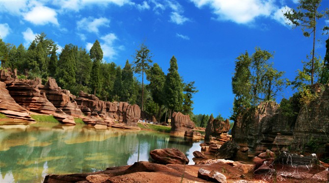 據(jù)地質(zhì)專家考證:紅色石林巖石形成的歷史約4。5億年,地質(zhì)史上稱之為揚子古海(海底沉積了大量混合泥沙的碳酸鹽物質(zhì),經(jīng)地殼運動和侵蝕、溶蝕作用形成了這片美麗的地質(zhì)奇觀)。景區(qū)內(nèi)遍布高大奇石,造型各異、顏色變化多端,且隨天氣、時間、季節(jié)變化而變化,晴紅雨黑、陰轉(zhuǎn)褐紅、晨昏有別。 景區(qū)內(nèi)石景有:蜀犬吠日、乳燕待哺、樓蘭古城、蝸牛搬家、七彩迷宮、利劍刺空、航母巡游、石兵列陣、少女出浴、觀音坐蓮、石鞭候主、靈龜探海、粽熊迎客、天狗吠日、水獺望云、母雞搗窩、駝鈴聲聲····尤以“巨人圓”、“古城故宮”、“八卦奇陣”、“諸葛藏書”為奇石絕景中的最佳。 景區(qū)內(nèi)還有地下溶洞、絕壁天坑、神秘地坑、千年古木、土家山寨、土風(fēng)民俗、集商遺址····